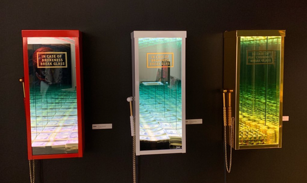 In this collection by ZMK, you'll find a diverse reimagination of the humble fire extinguisher case. Bringing this utilitarian silhouette from functional to whimsical with his signature infinity glass, you'll find an endless emergency stash of anything you need- whatever the "case" may be